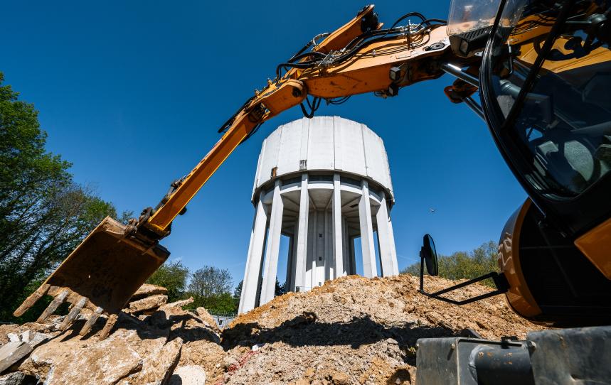 La construction neuve, semi-enterrée au pied du château d’eau existant, épouse la pente naturelle du site afin de s’intégrer dans l’environnement boisé. Seule une butte enherbée est visible depuis le chemin public longeant le terrain, et la façade du bâtiment est habillée de panneaux en acier laqué irisé brun-vert, offrant des perceptions variées se fondant dans le paysage.