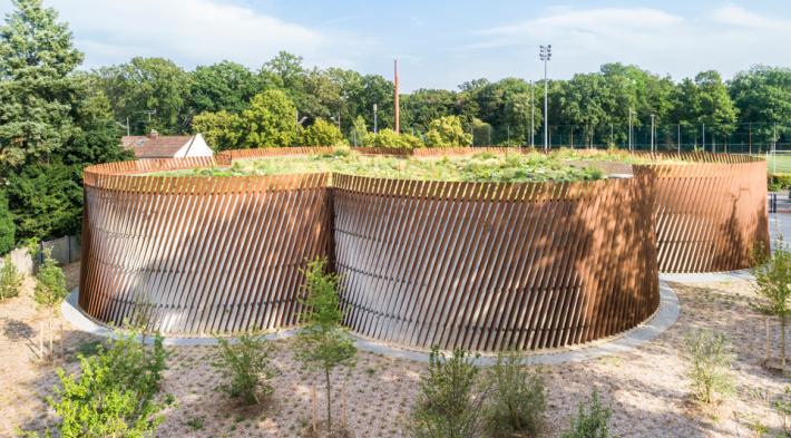 L’intégration environnementale de l’ouvrage a été particulièrement soignée au travers d’un réaménagement paysager complet du site. Outre, la création d’une lisière boisée par la plantation de nouveaux arbres de hautes tiges et d’essences forestières, en remplacement des arbres existants, la toiture du nouveau bâtiment accueille une clairière herbacée. Ainsi l’identité forestière du site a été préservée et renforcée.