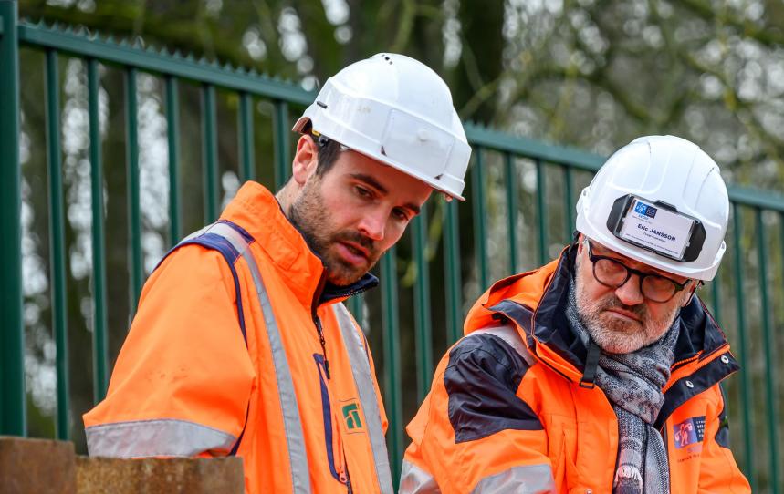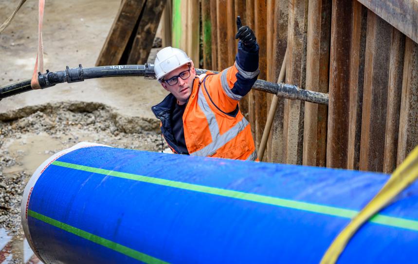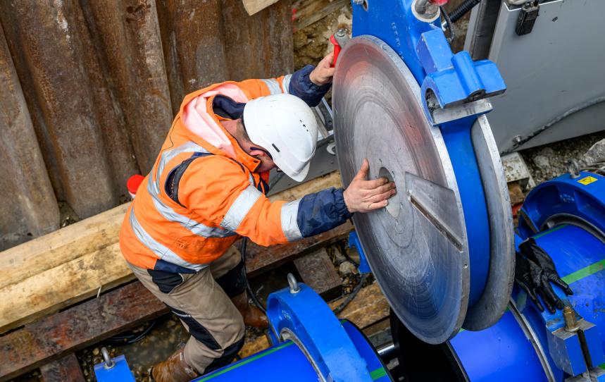 Le chantier, c'est un chantier de restructuration du réseau de transport entre Livry-Gargan et Villeparisis. Le but est de renforcer le maillage du réseau (Boulevard Schumman : pose d’une nouvelle canalisation en tubage DN 300 sur 1,2 km jusqu’au printemps 2024). Derrière il y a une deuxième phase avec le renouvellement de la canalisation existante où on vient tuber en fait une nouvelle canalisation dans l'ancienne. On fait du soudage de canalisations en PEHD (Polyéthylène haute densité) avec des barres de 12 mètres sur une distance d'à peu près 500 mètres. C'est des travaux qui nécessitent un poste de soudure, des tuyaux en PEHD et donc un certain nombre de matériel comme une pelle pour manœuvrer et un treuil, comme je disais, de 20 tonnes qui permet de tirer l'ensemble du puit d'entrée au puit de sortie.