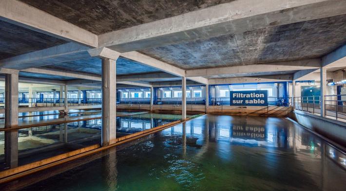 Située après la décantation et avant l’ozonation, l’étape de filtration de l’usine de Choisy-le-Roi est riche de 53 filtres à sable. C’est un procédé d'épuration biologique qui consiste à faire passer l'eau à traiter à travers un lit de matériau filtrant comme le sable. Au cours de ce passage, la qualité de l'eau s'améliore considérablement par la diminution du nombre de micro-organismes et l'élimination de matières en suspension.